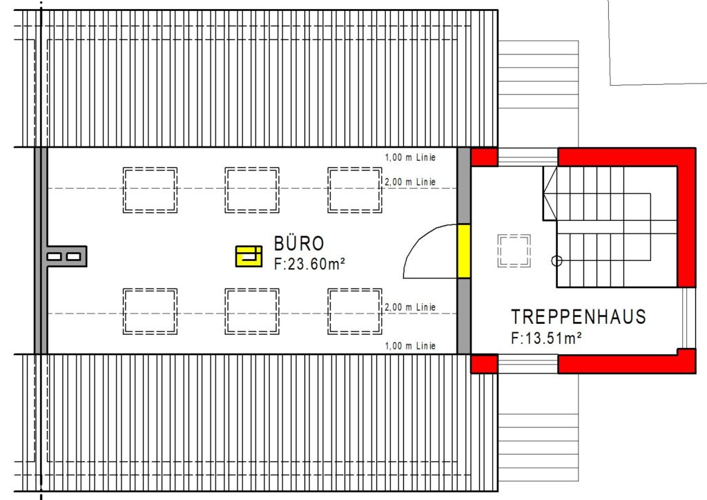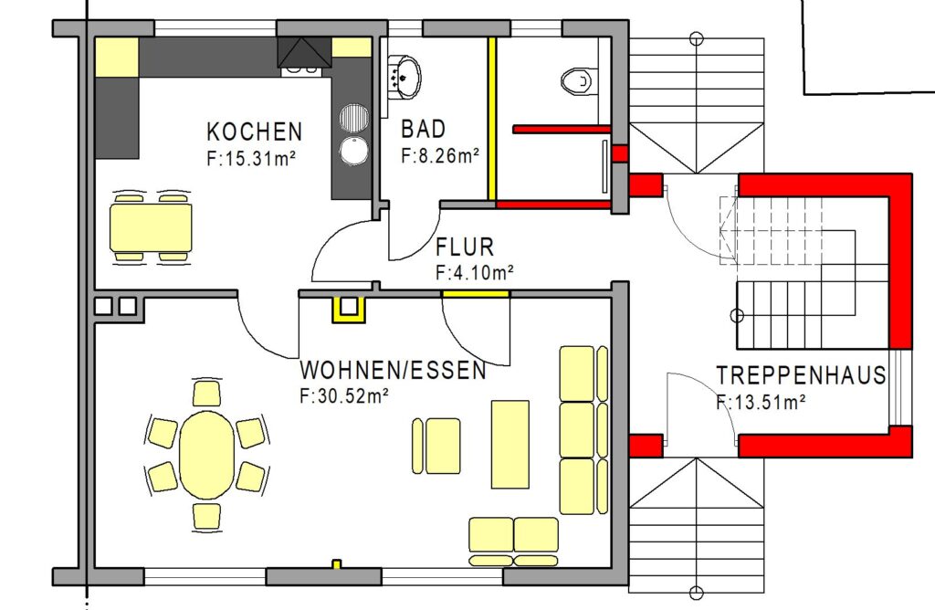 Abbruch und Rot ist Neu, auch wo ein Fenster geschlossen wird. Das ist halt neu. Und das Treppenhaus habe ich nicht ganz so klein gemacht, weil ich dann immer denke, naja, man kommt ja auch mit einem Kinderwagen rein oder mit irgendwelchen Sachen.