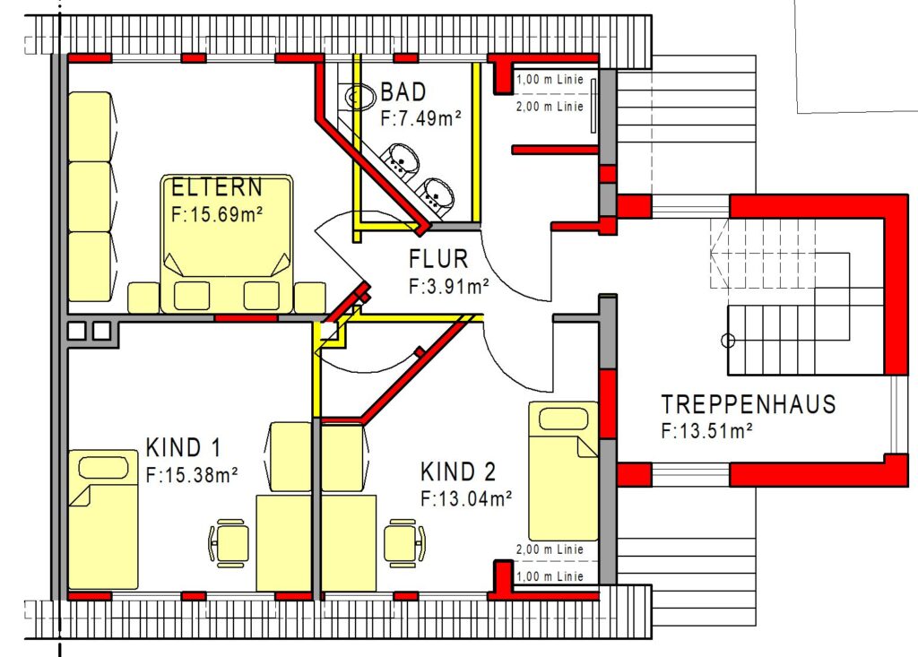 Da habe ich den Flurbereich verändert. Es ist relativ massiv, was da passiert ist. Aber dadurch habe ich es halt erreicht, dass im Obergeschoss jetzt zwei Kinderzimmer sind und ein Elternschlafzimmer und halt noch das Badezimmer.